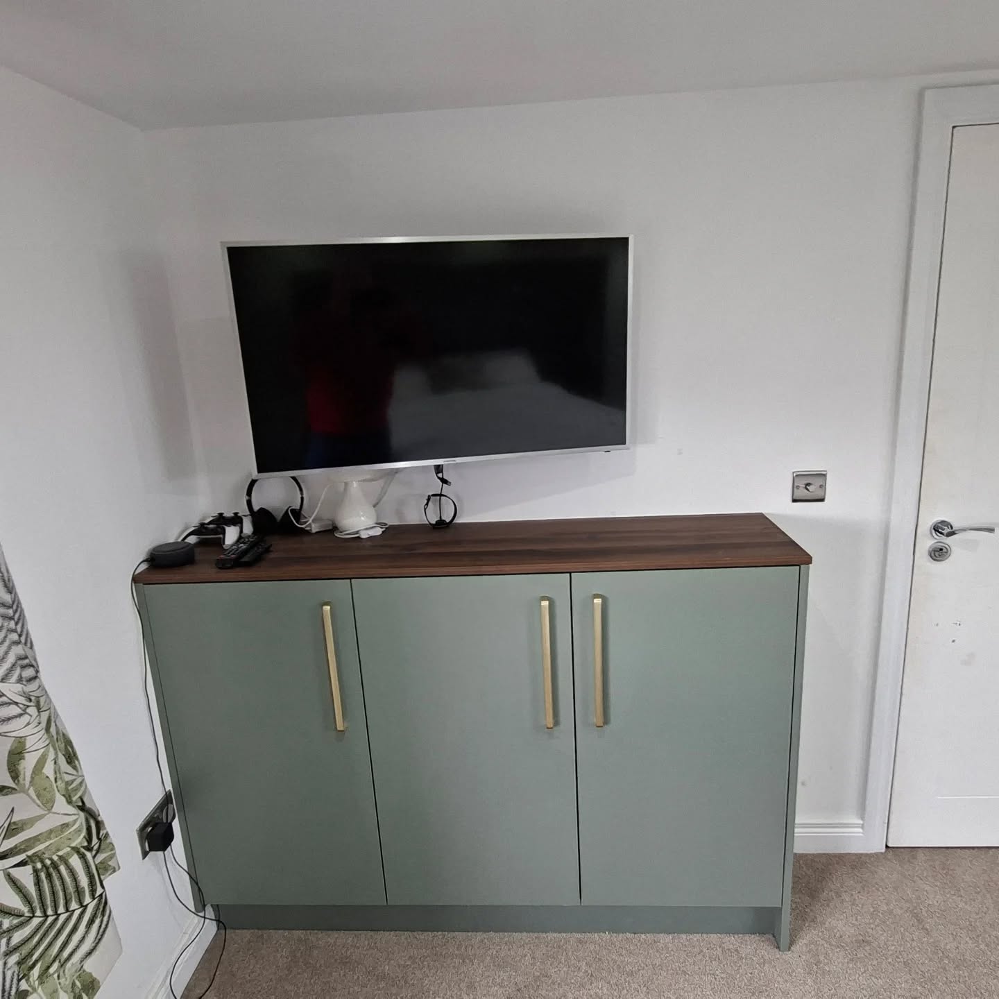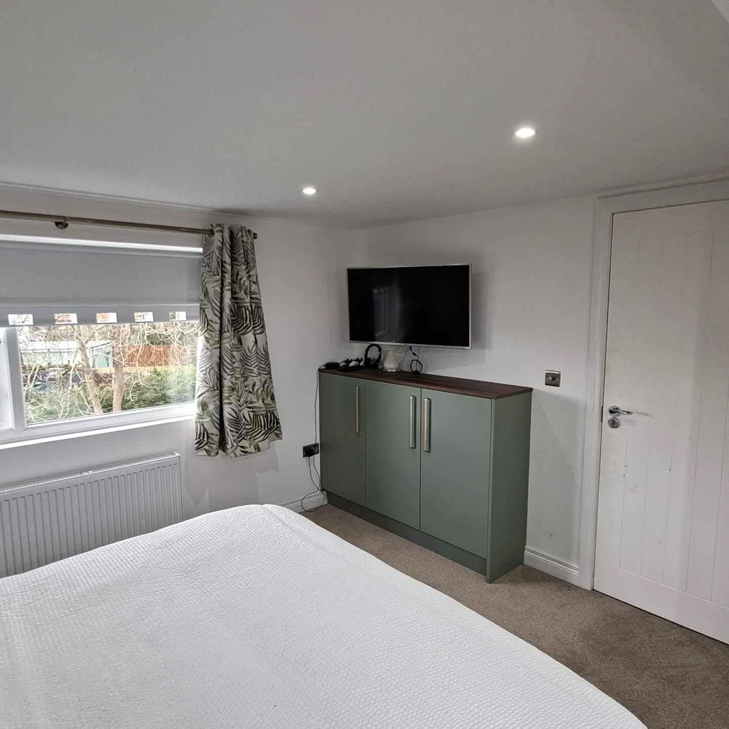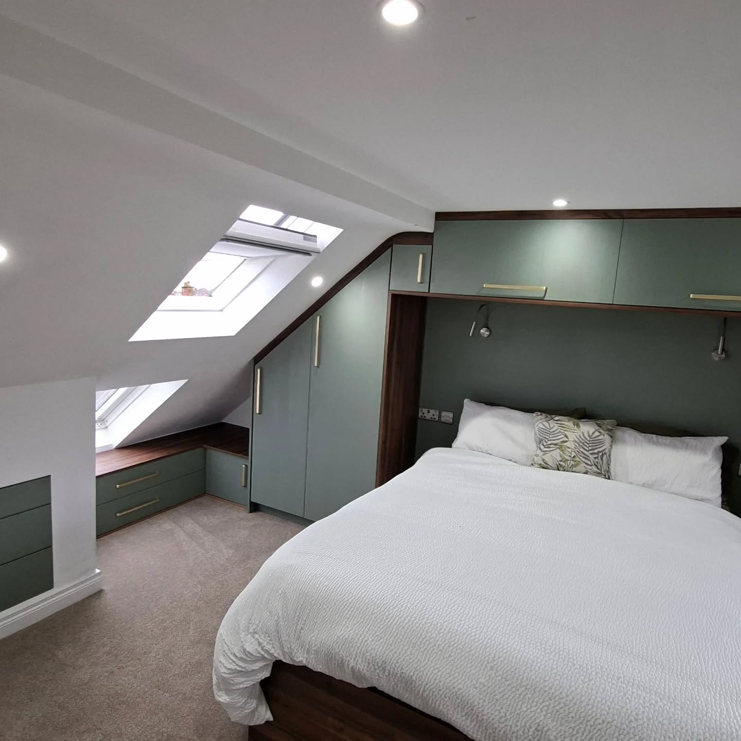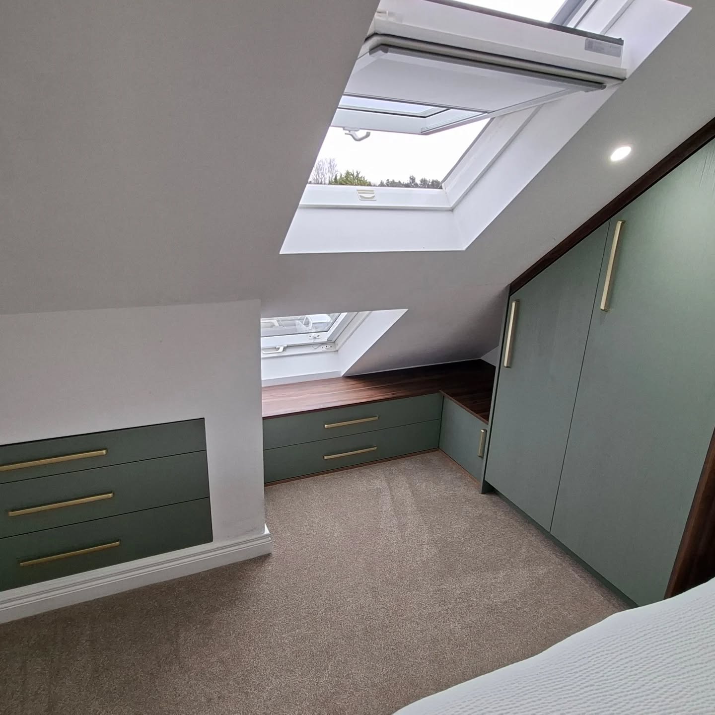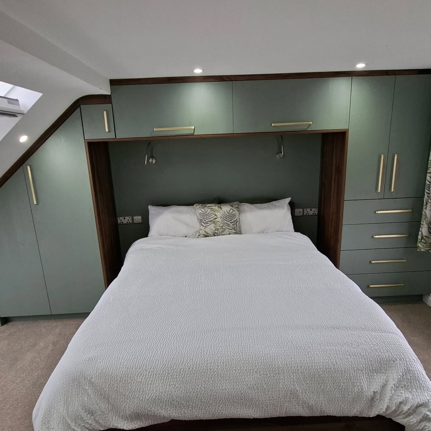 This bespoke bedroom project features custom built-in wardrobes finished in elegant Reed Green with Dark Walnut detailing, creating a warm and contemporary storage solution. Designed to maximise space and functionality, the fitted wardrobes provide generous hanging and shelving while maintaining a clean, streamlined look. The combination of rich walnut tones and soft green cabinetry adds depth and character, transforming the bedroom into a stylish and highly practical space.